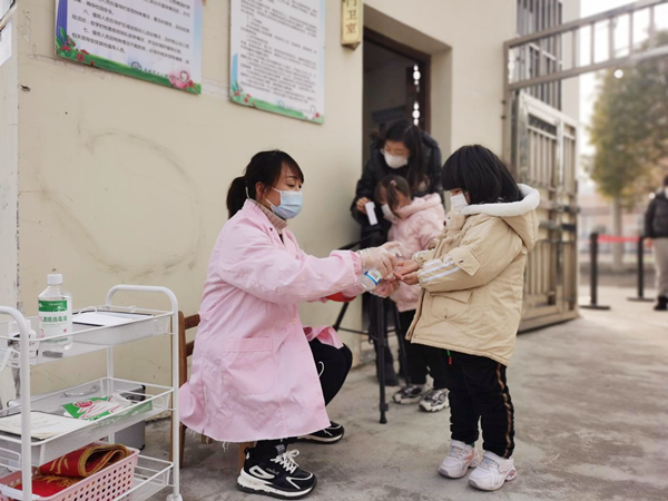 情景二:测温、保健老师晨检、手部消毒、口腔检查和精神状态等查看,均无异常方可入园,幼儿无异常家长从撤离通道离开。