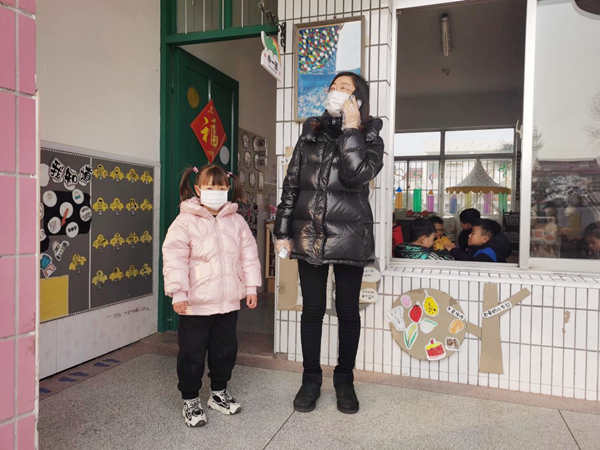情景八:大、中、小班错峰离园,师生戴好口罩将幼儿送至大门口,直接送到家长手中,避免家长入园。