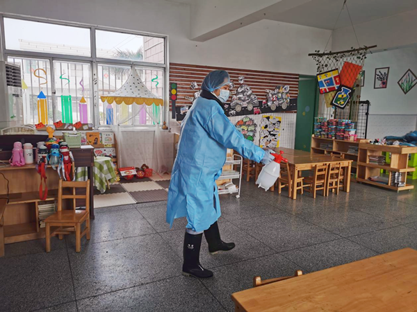 情景七:保育老师对所在活动室及所涉及的公共场所进行消毒。